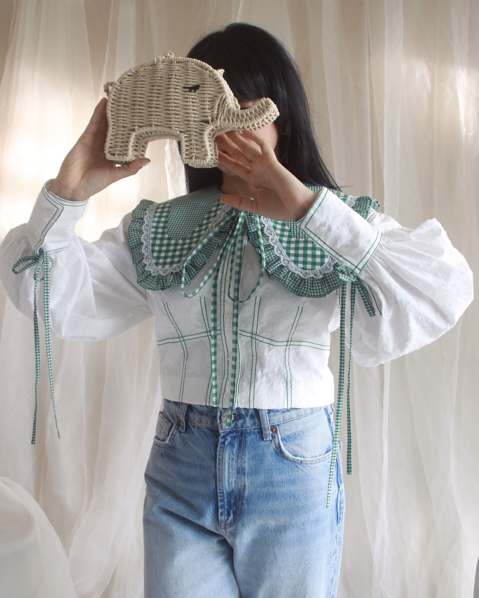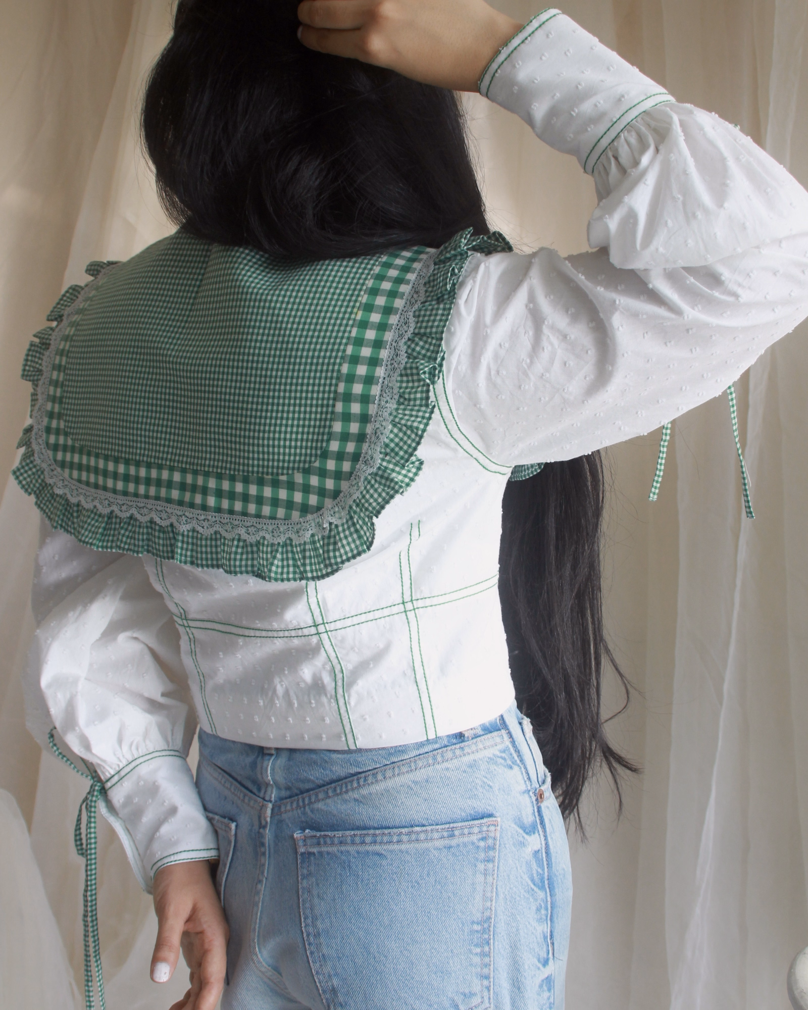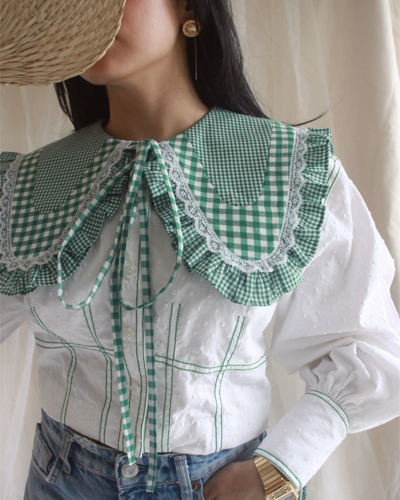Embrace timeless charm with the Frangipani blouse, featuring contrast top-stitch details, an oversized ruffled collar with a neck tie, and voluminous sleeves with contrast gingham checks. Ideal for a cozy bookshop visit or a